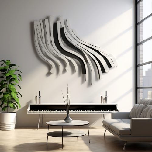 Create a wall art decoration featuring an abstract or stylized piano shape. The design should be in black and white, with a balance of light and shadow to give depth and dimension. The piano can be either upright or grand, but it should be the central focus of the piece. Add subtle artistic elements to make the design unique, while maintaining a minimalistic approach. The overall composition should be aesthetically pleasing and suitable for display on a wall.