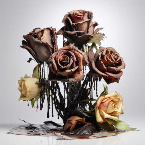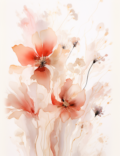 acrylic, gold, watercolor, flowers, flower art by kate sylvia p t c, in the style of dark white and light coral, digital gradient blends, delicate floral studies, light coral and light gray, white and ruby, ferrania p30, mist --ar 99:128