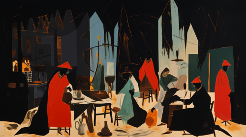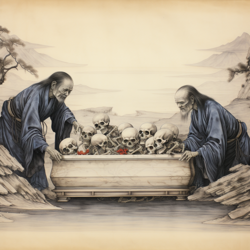 androgyneous man being buried with his smartphone lit up by robed men, shadows and fog, eerie, japanese patchment ink art style