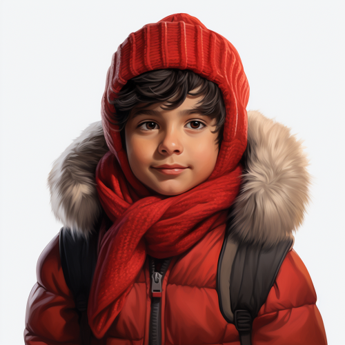 a boy in a dark red snowsuit, dark red mittins, dark blue knit scarf around his neck, The boy has tan skin and dark hair. inspired by Randy in A Christmas Story, 3D, realistic, white background