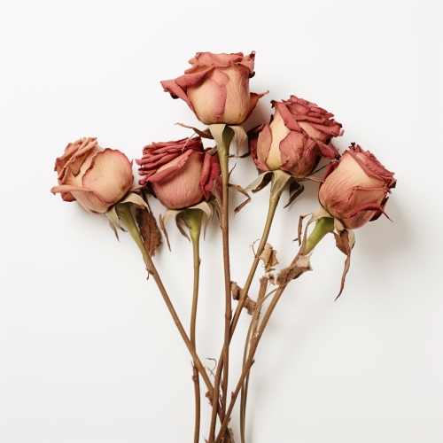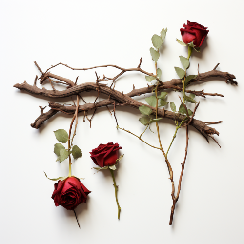 dry crown of thorns view from above next to 3 dried roses and long piece of wood on a white background