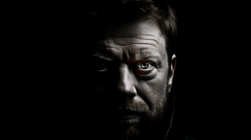 I'm looking for an image where only the head Eckhart Tolle is visible. Everything else in the frame should be pitch black, no background details, no shoulders, no distractions--just the head. The focus should be solely on the head, creating a stark contrast against a completely black backdrop. Use Bright Colours for the head, so the face really pops out. --ar 16:9