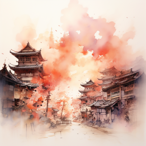 kyoto, big fire,soft focus , light gradation watercolor , dreamy , white background