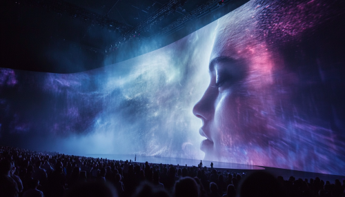 A breathtaking live show where a large audience is mesmerized by a stunning video projected on a massive screen. The crowd is captivated, their faces illuminated with awe and emotion as they watch the vibrant visuals unfold. The scene is filled with a sense of wonder and energy, with hundreds of people gathered together, sharing the emotional moment. The atmosphere is dramatic, with dynamic lighting and vivid colors, creating an immersive experience that draws everyone into the magic of the spectacle --ar 7:4 --v 6.1