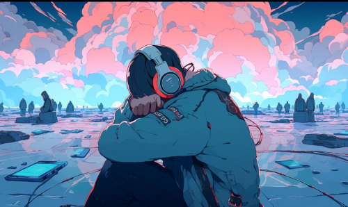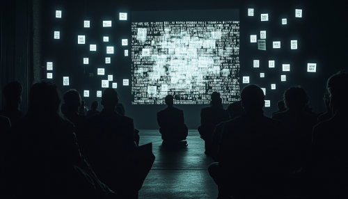 A dark, dreamlike scene where a captivated audience watches an emotional video. The large screen in front of them is filled with floating, glowing letters and words, creating a surreal and poetic atmosphere. The people are sitting in awe, their faces softly illuminated by the letters on the screen. The overall tone is moody and ethereal, with deep shadows and subtle light enhancing the emotional, almost magical experience --ar 7:4 --v 6.1