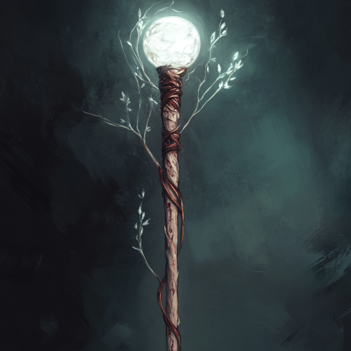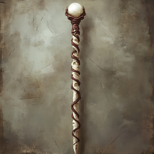 a magic staff was made of whitish bone with soft maroon lines running up and down its length. It was long and carved with swirling shoots running toward the tip, and at its end the swirls converged and wrapped around a milky, smoky white orb, and formed a point. An unknown language was inscribed in the bone, style if worls of warcraft