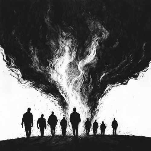 Silhouettes of people on fire, Black-and-white, abstract, monochromatic, conceptual, expressive, graphic, symbolic, minimalist, artistic, hand-drawn style, simplified design, psychological, dramatic, textured, contrasting, silhouette-based, linear, metaphorical, experimental, visually deep. --s 250