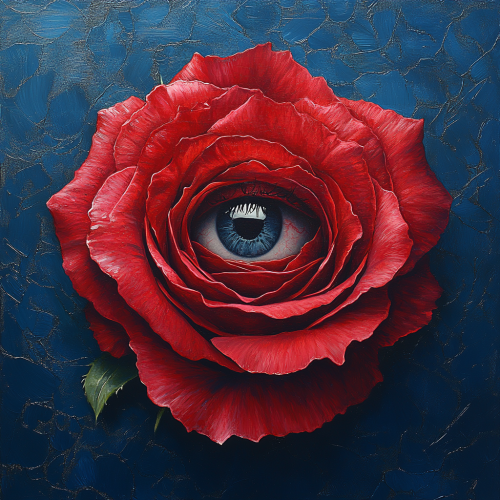 On a deep blue background, depict a single red rose from a top-down perspective. The petals of the rose should be beautifully spread out, and in the center of the flower, place a human eye with eyelids, eyelashes, and eyebrows. Ensure that the elements are harmoniously integrated and aesthetically pleasing, avoiding any unsettling or creepy impression. Maintain clarity and purity in the composition, emphasizing delicacy and elegance. --s 750