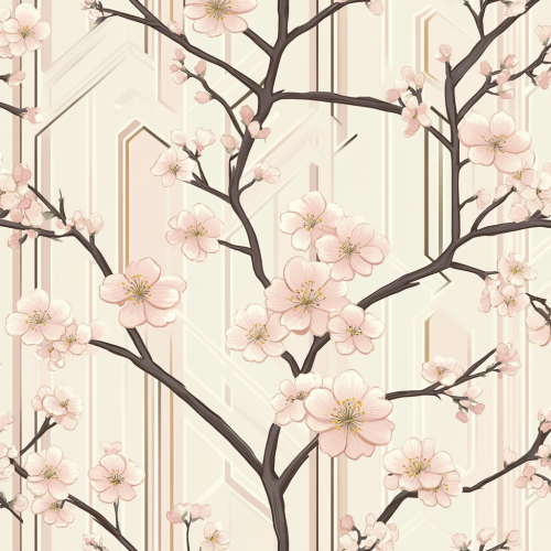 Create a highly detailed, retro-inspired wallpaper design that is influenced by the Art Deco style, with a graphic interpretation of cherry blossoms. The pattern should feature elegant, stylized cherry blossoms with delicate branches arranged in geometric, symmetrical patterns reminiscent of classic Art Deco designs. The blossoms themselves should be simplified yet detailed, with bold, clean lines and soft pastel colors like blush pink, lavender, and cream, contrasted by metallic accents in gold or bronze. The background should have subtle, repeating geometric shapes, giving it a rich, textured feel, while maintaining the elegance and sophistication of Art Deco. The overall design should evoke a sense of nostalgia, glamour, and refinement, with the cherry blossoms adding a natural, organic element to the structured, ornamental patterns typical of the Art Deco movement