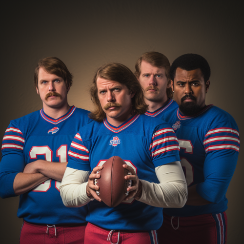 American football team in the style of Wes Anderson, real photograph, blue, red, white, sweaters, Buffalo Bills