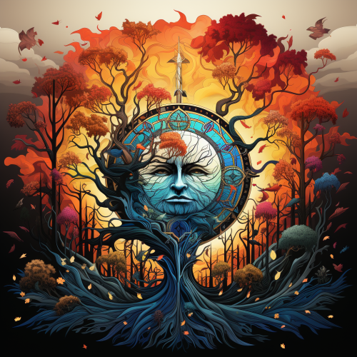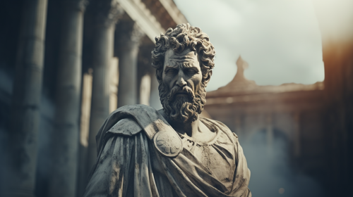 The portrait of the statue of Marcus Aurelius looked angry. Portrait of the whole body. Background of old buildings or historical objects or fire or clouds or something extraordinary and inspiring but blurred, 8k --ar 16:9