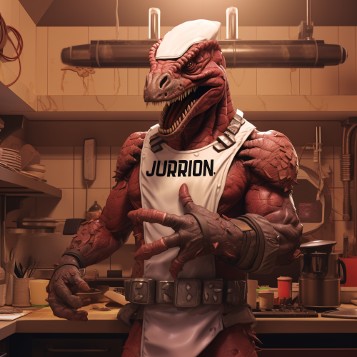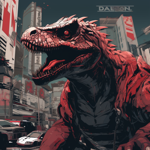 an image of a dinosaur, in the style of black lagoon anime, 8k resolution, zeiss ikon zm, futuristic robots, urban decay, album covers, dark crimson and white