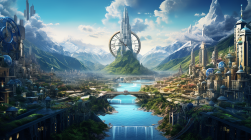 Design a surreal landscape where a river of currency flows from a mountain peak of traditional assets into a futuristic city skyline built of alternative assets, all under a sky filled with ticking clocks and risk-adjusted return equations --ar 16:9