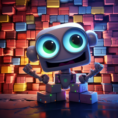 a cute robot stacking different pieces of a wall with smile, vibrant, 3d rendered, neon blurry background, pixar style,