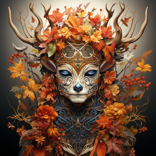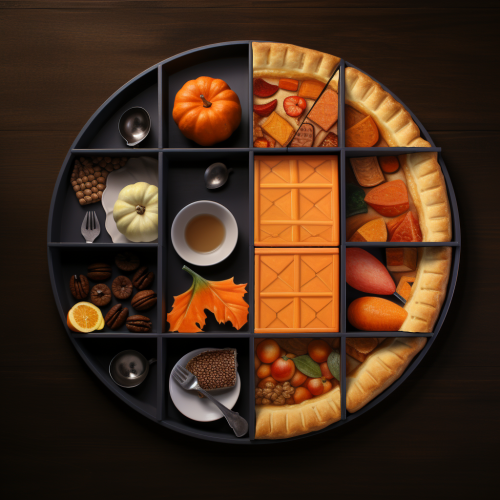 a square divided into quarters; in each quarter is a different fall themed item. One has a leaf, another has a pumpkin, another has a cup of cider, another has a pie