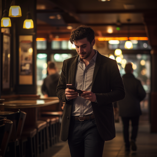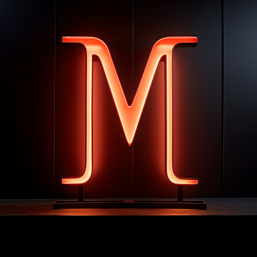 a broad sign with the letter “M” written in a simplistic bold font. The sign should be simple yet elegant. The color scheme should be black, white, and gray.