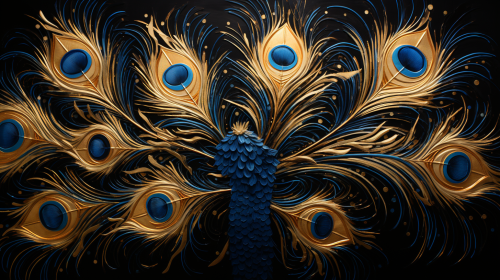 A high-end pattern painting with a luxurious feel, featuring a symmetrical arrangement of gilded peacock feathers on a deep, velvety black background, evoking a sense of regal opulence and extravagance, Painting, executed with acrylic and metallic gold leaf for a rich texture, --ar 16:9 --s 250