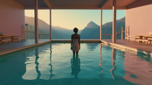 a dark complexion woman in late 20s coming out of an infinity pool, at the grand budapest hotel. Set in a Wes Anderson movie, with Wes Anderson aesthetics & style, super realistic hyper realistic --ar 16:9 --v 5.1