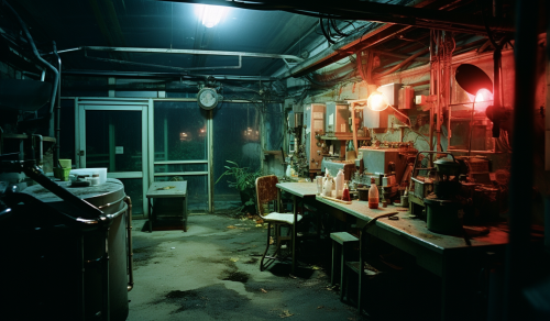 Outside of Alexander Sasha Shulgin's lab at night, film grain, kodak portra 800, sony vx1000 fisheye lens, harsh flash --ar 24:14