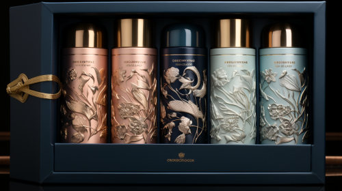 A bespoke, handcrafted pattern for a luxury brand's packaging, featuring a regal combination of embossed metallic foil and intricate filigree designs, conveying a sense of exclusivity and prestige, Packaging design, executed with precision embossing and metallic foiling techniques, --ar 16:9 --s 250