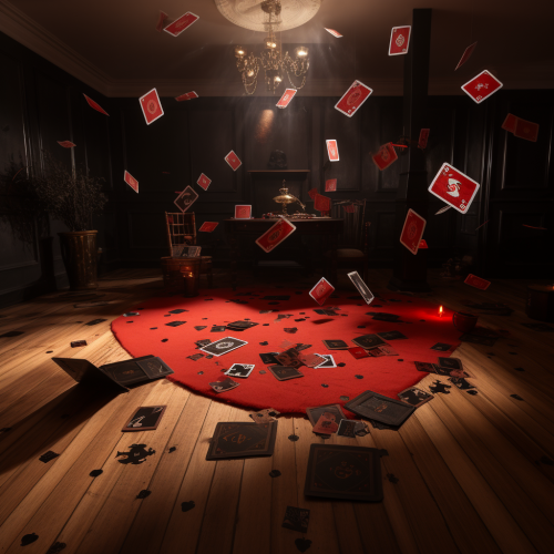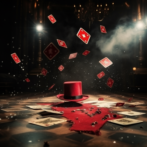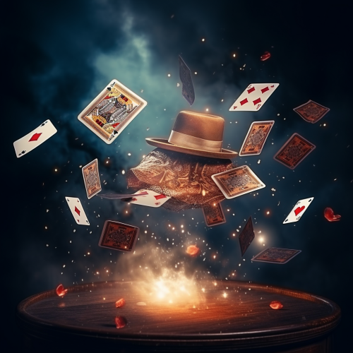 Playing cards fly out of the magic hat, playing card symbols through the air, magical atmosphere --style raw