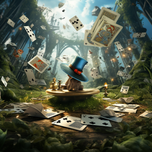 In a landscape like Disney's Alice in Wonderland, there is a magic top hat on the ground, face up, cards fly out, magical atmosphere, --style raw