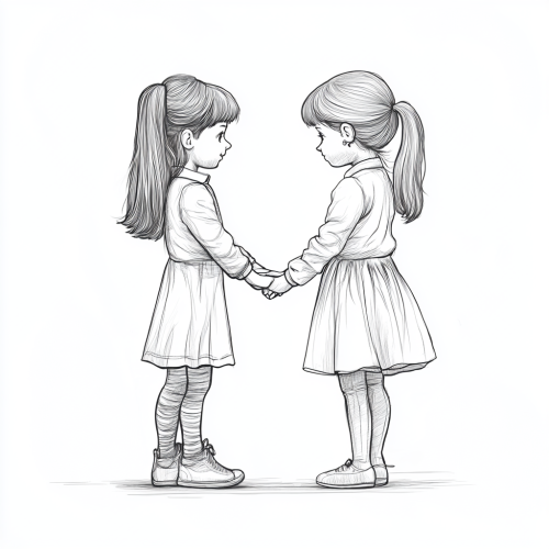 Boy and girl holding hands in a simple scene, thick monoline outline, fully closed shapes, no gaps, pure white background. No color, only outline drawing in thick outline, shapes filled with white color --s 250