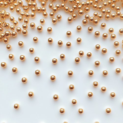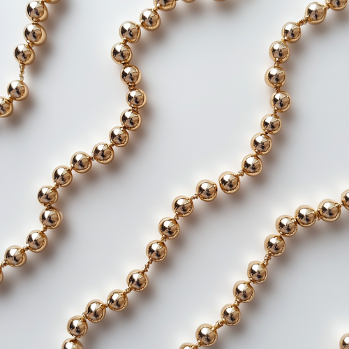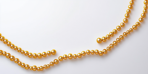 Top-down view of a golden garland made of small round beads strung on a visible thread, arranged in a wavy pattern in the corners of a plain white background, shiny and reflective, no overlapping, minimalistic design --ar 1:1 --s 250 --style raw
