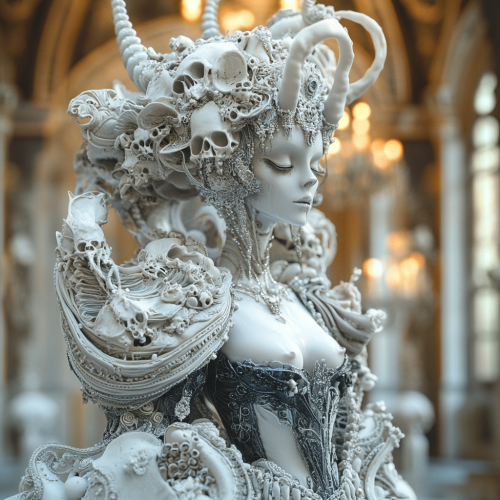 beautiful female demon of porcelain catskulls, huge ivory interior, cathedral of bones, nacre, pearls, HD photography, highly detailed, cinematic lighting, character design, haute couture, intricate details, 8k --v 6.1