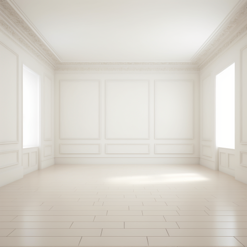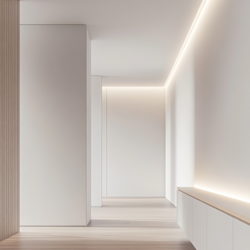 Create a minimalist hallway scene where 80% of the frame is a close-up view of a smooth, white wall. The wall should be perfectly even and well-lit with soft, warm lighting to create a serene and clean look. At the bottom edge, include a very subtle, blurred hint of a plain, low cabinet in a light, natural wood or white color, without any handles or decorations. The clean lines of the cabinet should complement the simplicity of the wall without drawing attention away from it.