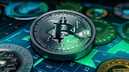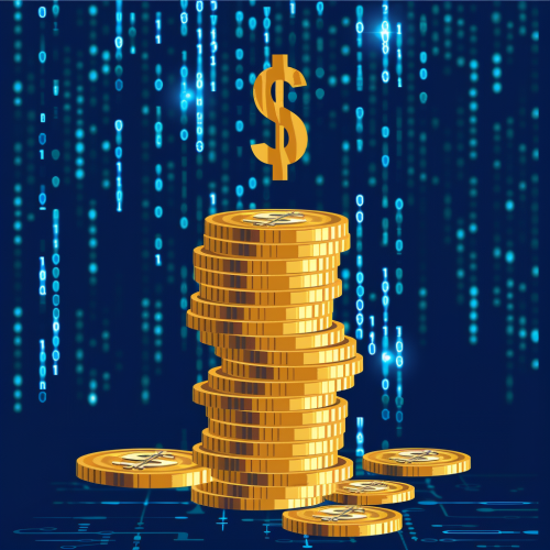 a stack of money coins which are reminiscient of the symbol for an SQL database, blue background with binary code behind it, illustration, minimalist --v 6.0 --s 250