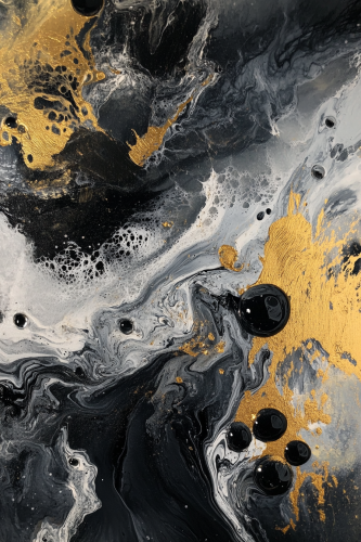 abstract painting inspired from Sea waves that destroyed on beach rocks , sea drops , Arabic theme , curvey dynamic brushes , 64 k , luxury theme , colors black grey silver gold --ar 2:3