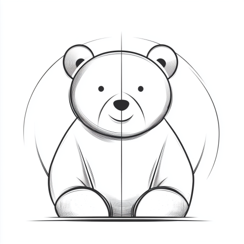 A minimalbear made from simple geometric shapes, outlined with no fill. The body is an circle or oval, the head is a circle, with small circular ears. The eyes are tiny dots,. The , the bear is simling entire design is clean and outlined with no colors or shading
