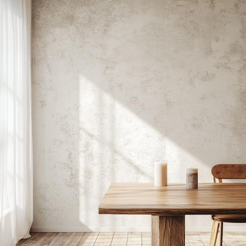 Create a warm dining room interior where 80% of the image is occupied by a close-up of a smooth, white wall that serves as the focal point for wallpaper display. The wall should be perfectly smooth and bathed in soft, diffused lighting. At the far side of the frame, add a blurred hint of a rustic wooden dining table and the back of a warm-toned chair, with a small, unlit candle barely visible to suggest a cozy ambiance. The floor should be light wood to complement the warmth of the scene without taking attention from the wall.