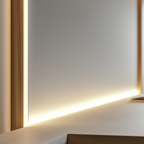 Create a close-up, minimalist home office interior where 80% of the frame is a smooth, white wall that serves as the main element. The wall should be flawlessly smooth and well-lit with soft, warm lighting to provide a cozy ambiance. At the bottom corner of the frame, include a very faint, blurred hint of a simple, flat desk edge in a light wood finish, completely uncluttered with no objects on it. The overall look should be clean and focused on the wall.