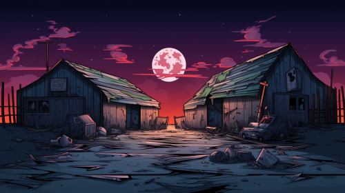 frontal view of giant abandoned warehouses with a big broken sign, night scene, cartoon style, --ar 16:9