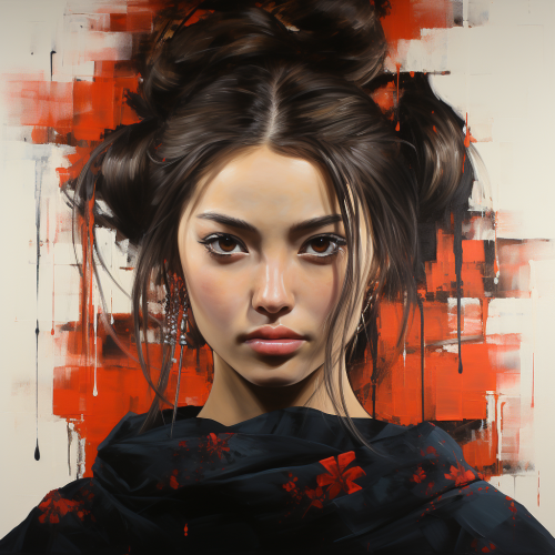 **agressive japanese geisha with a deep stare, stencil, large brush strokes, pop art, black tones with red details, high contrast, --v 5.2 --s 750