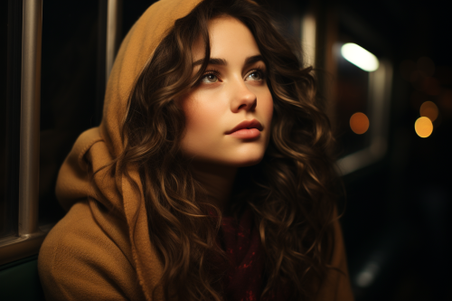 a photo of a beatiful woman sitting on empty train at night looking out the window into the darkness, dark lighting, ambient lighting --ar 9:6 --upbeta --style raw --s 750