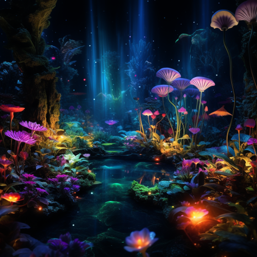 bioluminescent garden, seen in full spectrum light, ultra HD, 8k, trippy
