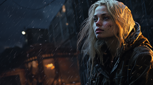 an attractive blonde apocalypse survivor with sparkles coming from the sky. ominous. dayz art style --ar 16:9