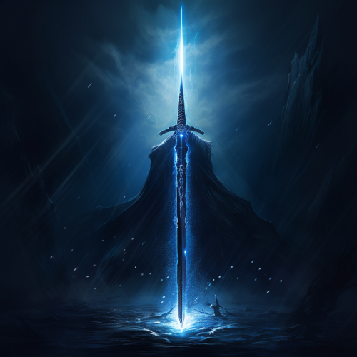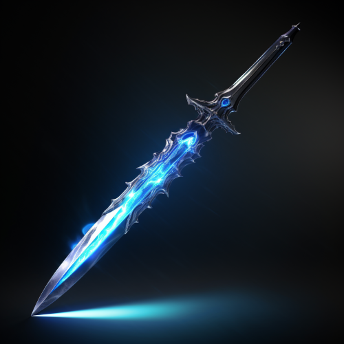a very thin, very long, pointed sword emitting blue light from the blade with a white background
