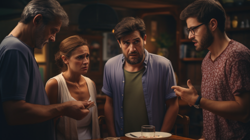 anry man argue to his confused family and relatives indoor photorealistic --ar 16:9 --s 250