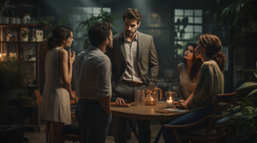man argue to his confused family and relatives indoor photorealistic --ar 16:9 --s 250