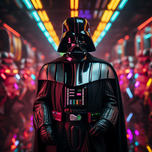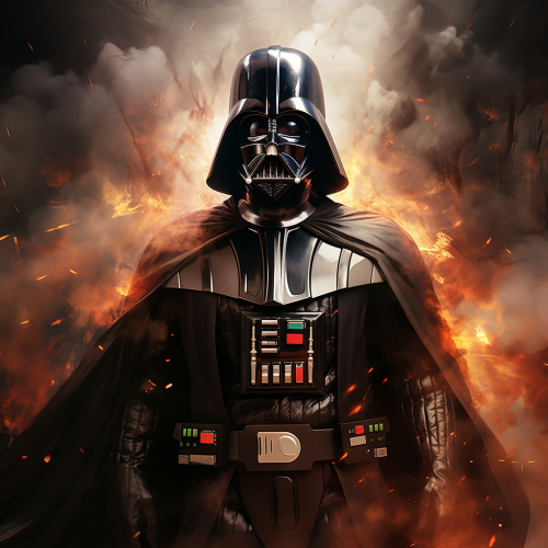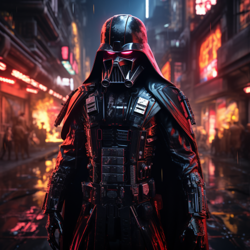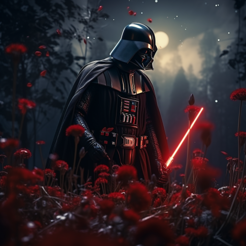 4k stillshot, darth Vader full body shot holding red lightsaber in a field of flowers, dark night sky, glow from lightsaber, reflection, high resolution, dark theme, dim lighting, glow effect --upbeta --v 5.2 --s 250