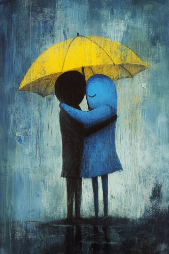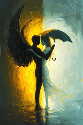 autostereographic and melancholic style, it shows one dark ghostly silhouette and a second one bright and yellow with wings, holding a umbrella, the bright silhouette protects the other one from the raind and gives him a hug, the sky looks like if you mixed up all diffrent oil colors in water, melancholic art and a whole lot of sureality, --ar 2:3 --v 6.1