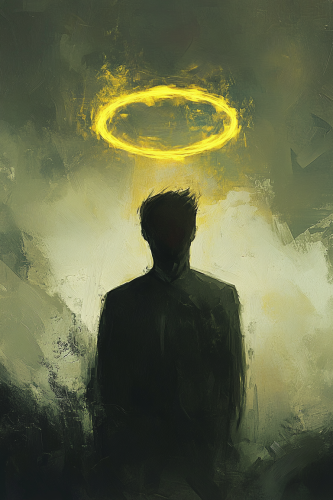 autostereographic and melancholic style, it shows a dark ghostly silhouette, he has an shining yellow angle ring above his head, the sky looks like if you mixed up all diffrent rainbow oil colors, melancholic art and a whole lot of sureality, --ar 2:3 --v 6.1