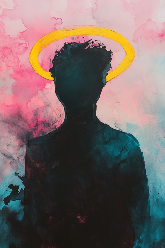 autostereographic and melancholic style, it shows a dark ghostly silhouette, he has an shining yellow angle ring above his head, the sky looks like if you mixed up all diffrent oil colors mostly pink and blue, watercolor art and a whole lot of sureality, --ar 2:3 --v 6.1