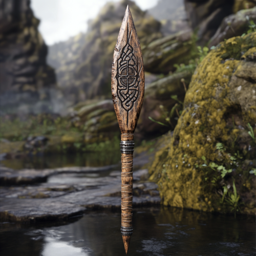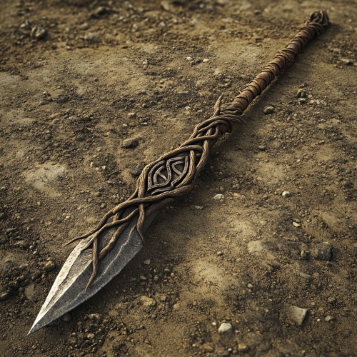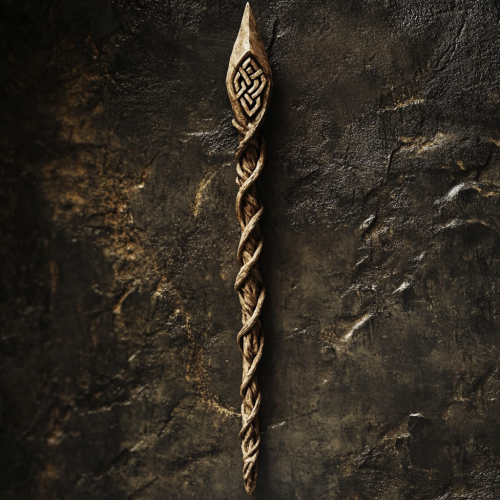 create an image of a spear long thin spear. The spear is made out of twisted roots. The spear will have an intricate runic symbol in the middle. Create the image in the style of a fancy photo in a very high end spear catalog. Highly detailed. Photo realistic. Battle worn. Gritty.
