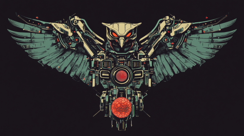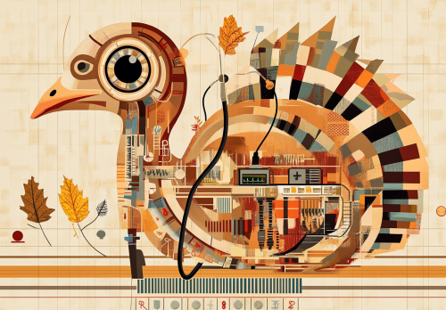 Happy turkey in the style of Art Deco, with medical equipment and leaves. Abstract geometric patterns and lines form an artistic background for 'Laverne'. A stylized robotic hand holds a stethoscope around its neck, symbolizing technology's role in medicine. The colors include shades of brown, beige, orange, grey, reds, yellows, and greens to create a vibrant yet balanced visual appeal. --ar 128:89
