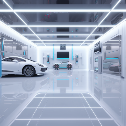 bright high-tech garage interior, predominantly white and light colors, vibrant LED spotlights, soft neon accents, sleek metallic and glass surfaces, modern industrial design, detailed floor texture, absolutely no car --ar 1:1 --v 5.0